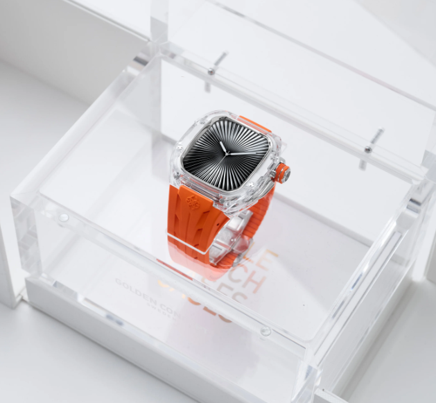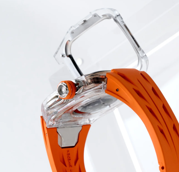 Серия Racing Sport Transparent возвращаются с новой, яркой энергией. Версия Sunset Orange сочетает в себе кристально прозрачный корпус и яркий оранжевый ремешок, создавая свежий, эффектный контраст. Созданные для Apple Watch Series 10 и 11, дополненные деталями из матовой стали, эти часы сочетают в себе строгий дизайн и повседневную универсальность с современной спортивной эстетикой.