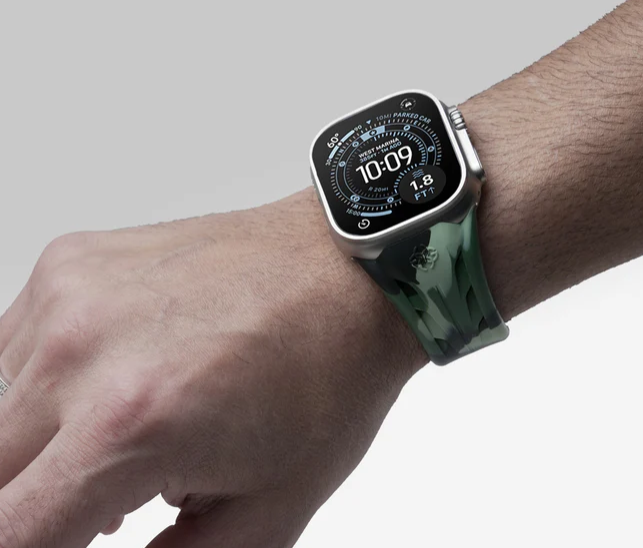 • Камуфляж «Рейнджер» придает Apple Watch брутальный, основательный вид. Оттенки зеленого и черного плавно перетекают друг в друга в многослойном узоре, создавая ремешок, который ощущается на запястье аутентично, прочно и выразительно.