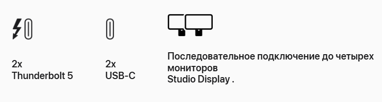- Два порта Thunderbolt 5 (до 120 Гбит/с) и два порта USB-C (до 10 Гбит/с)