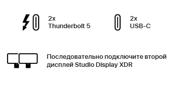 Монитор Studio Display XDR оснащен двумя мощными портами Thunderbolt 5 для подключения вашего Mac, высокоскоростных аксессуаров или дополнительных дисплеев. Два порта USB-C можно использовать для подключения внешних накопителей, клавиатуры или мыши.