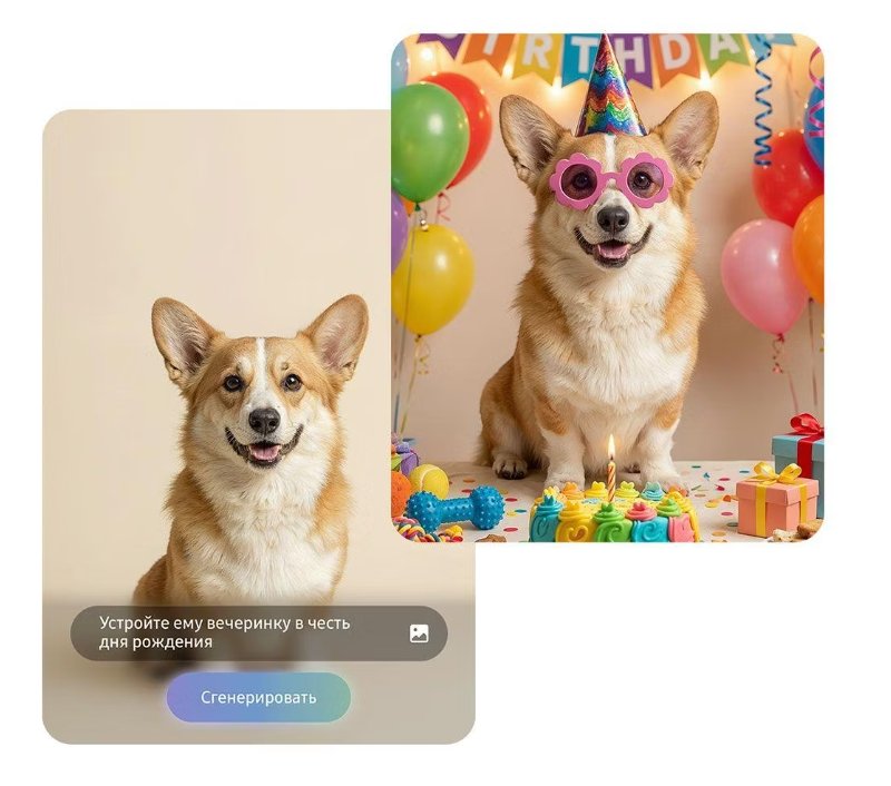 Быстро и легко редактируйте фотографии с помощью всего нескольких слов и AI. Добавляйте аксессуары и другие предметы на фотографии вашего питомца, описывая изменения, которые хотите внести. Galaxy AI воплотит ваше видение в жизнь за считанные минуты