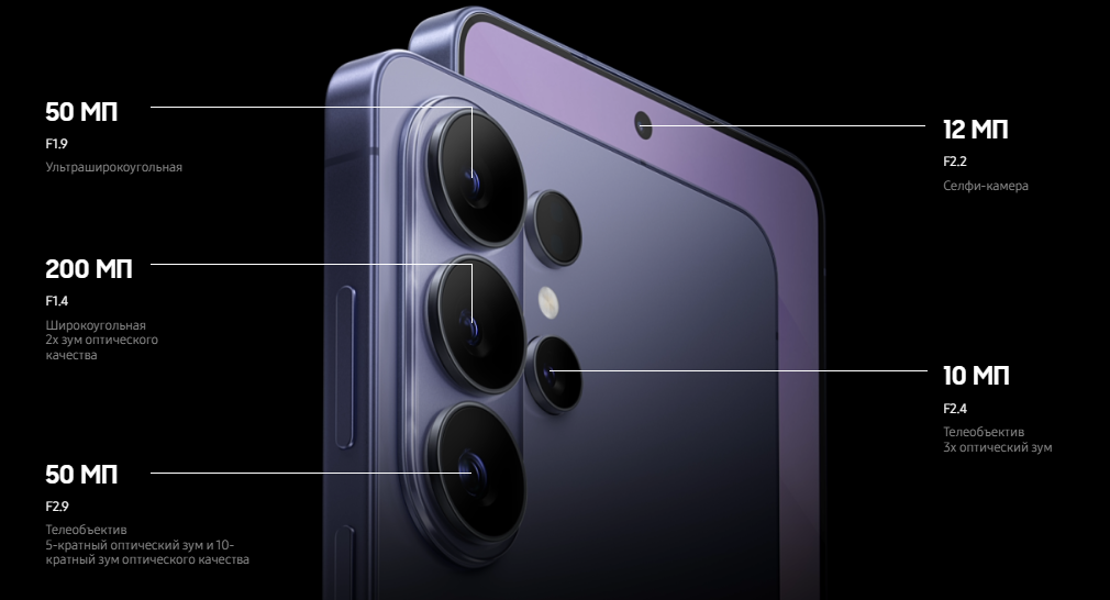 • Основная камера 200,0 MП + 50,0 MП + 50,0 MП + 10,0 MП