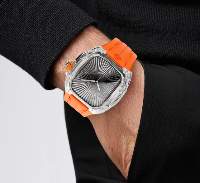 Серия Racing Sport Transparent возвращаются с новой, яркой энергией. Версия Sunset Orange сочетает в себе кристально прозрачный корпус и яркий оранжевый ремешок, создавая свежий, эффектный контраст. Созданные для Apple Watch Series 10 и 11, дополненные деталями из матовой стали, эти часы сочетают в себе строгий дизайн и повседневную универсальность с современной спортивной эстетикой.