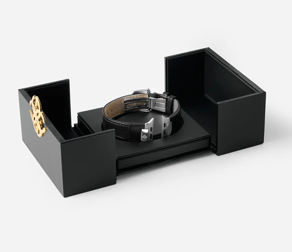 Тщательно продуманная коробка имеет изысканную внутреннюю отделку из черной кожи, которая усиливает ощущение роскоши. Это больше, чем просто упаковка; это свидетельство нашей приверженности к совершенству, превращающее распаковку ремешка в целое событие.