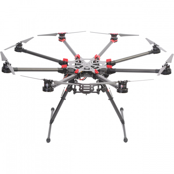 При весе всего лишь 4.4кг, DJI S1000+ имеет максимальную взлетную массу 11кг. Это означает, что он с успехом может нести на своем борту большинство современных DSLR камер и подвесов, включая Canon 5D Mark III. Используя в качестве батареи, аккумулятор LiPo 6S емкостью 16000mAh, он может провести в полете до 15 минут. Максимальное время полета протестировано в безветренный день с полезной нагрузкой 6.8кг, при висении на высоте 2 метра.