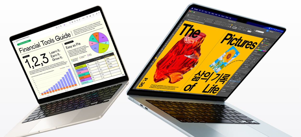 Два идеально портативных размера. 13-дюймовый MacBook Air — это идеальный ноутбук для работы в дороге, а 15-дюймовая модель предоставляет еще больше места на экране для многозадачности