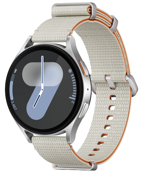 Подчеркните свой стиль с помощью Galaxy Watch7. Стильное сочетание плавных линий корпуса и контрастных акцентов элегантно смотрится на запястье, а волнообразный дизайн ремешка демонстрирует готовность к тренировкам. Устройства доступны в трех цветах: зеленый, серебро и белое золото